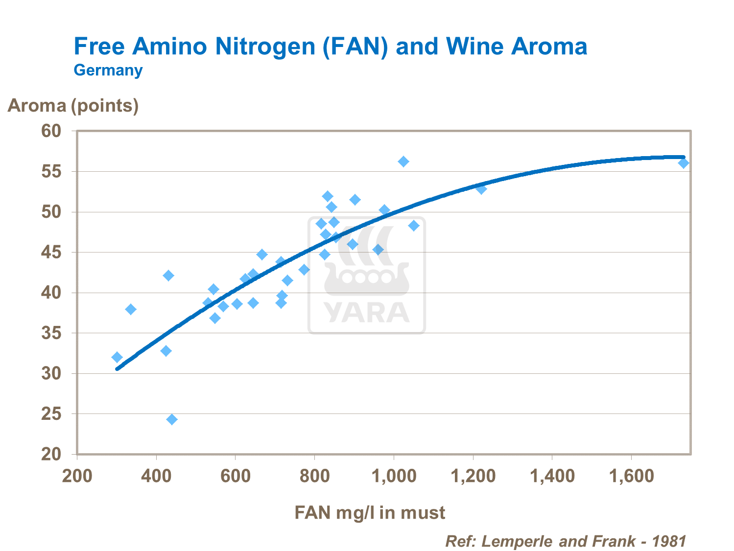 It can also affect the different types of alcohol present, as a result of yeast metabolism, in the resultant wine. Free amino nitrogen (FAN) is often used as a measure of the suitability of nitrogen types available for yeast growth and fermentation.