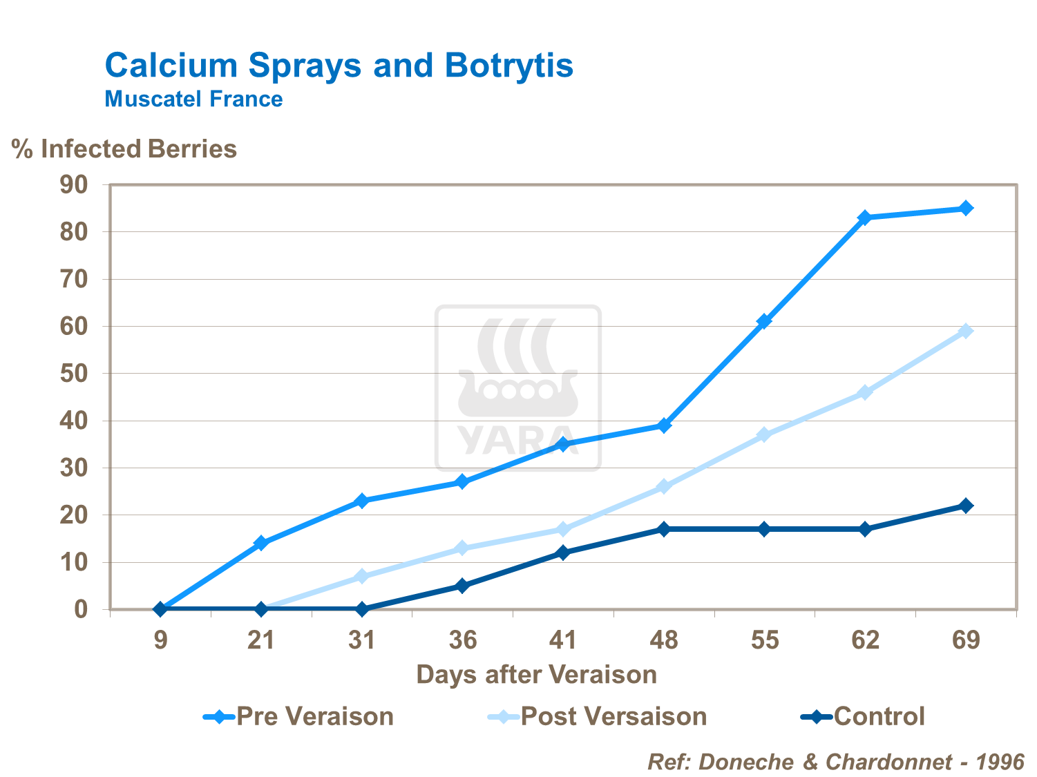 Calcium is beneficial in aiding plant resistance to diseases such as Botrytis on the vine. It does so by strengthening the cell wall membrane, thereby reducing disease impact, and also by directly inhibiting the activity of a specific pathogen enzyme (polygalacturonase), which dissolves the middle lamella of cell walls. Calcium sprays applied pre-veraison to the fruit are most effective.