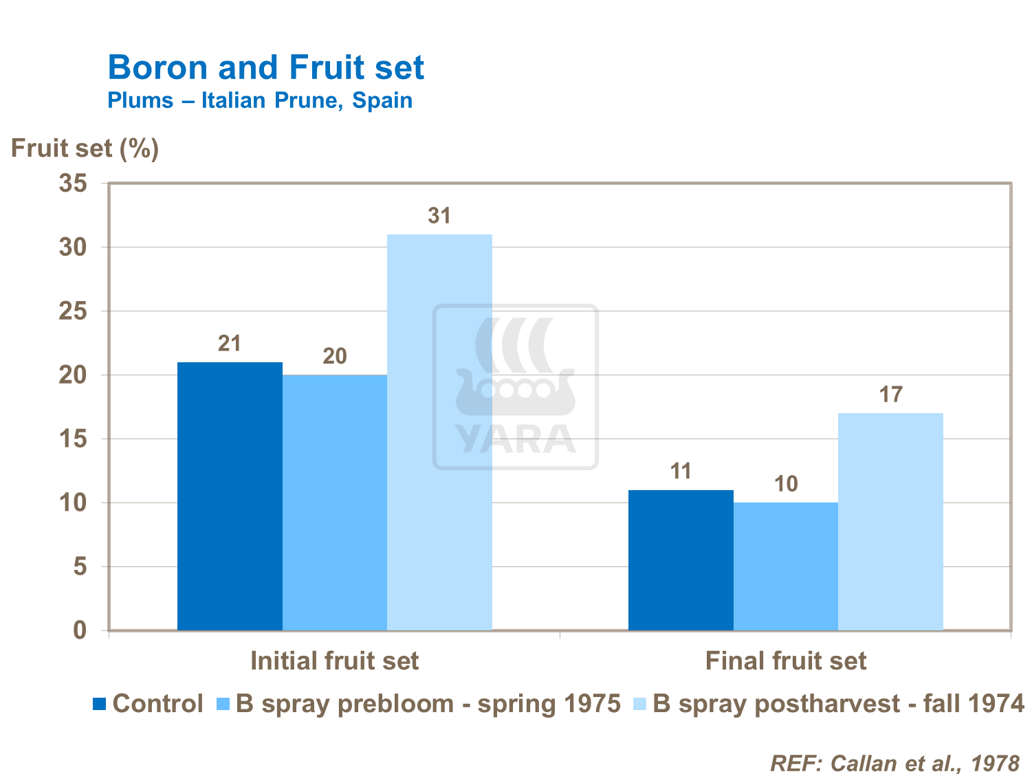 The key benefit from boron is at bud burst and flowering when it is used to maximize fruit set. Trials confirm that best results come from applying boron in the autumn two to three weeks before leaf-fall targeting the foliage and buds. This boron is then more available to encourage better flowering and fruit set in the following spring.